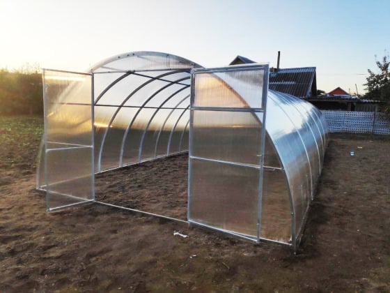 Farmer 4 kasvuhoone: tsingitud 40×20 mm nelikanttorust karkass, 4 m lai, 2 m kõrge, pikendatav 2 m moodulitega. 0,67 m kaarte samm, 6 mm polükarbonaat, 2 ust ja 2 tuulutusluuki.